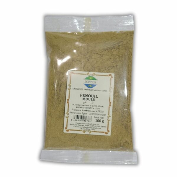 Le fenouil moulu 100g E/O est un condiment doux et anisé, parfait pour plats légers ou infusions digestives. Vente en gros sur Kartout Market.